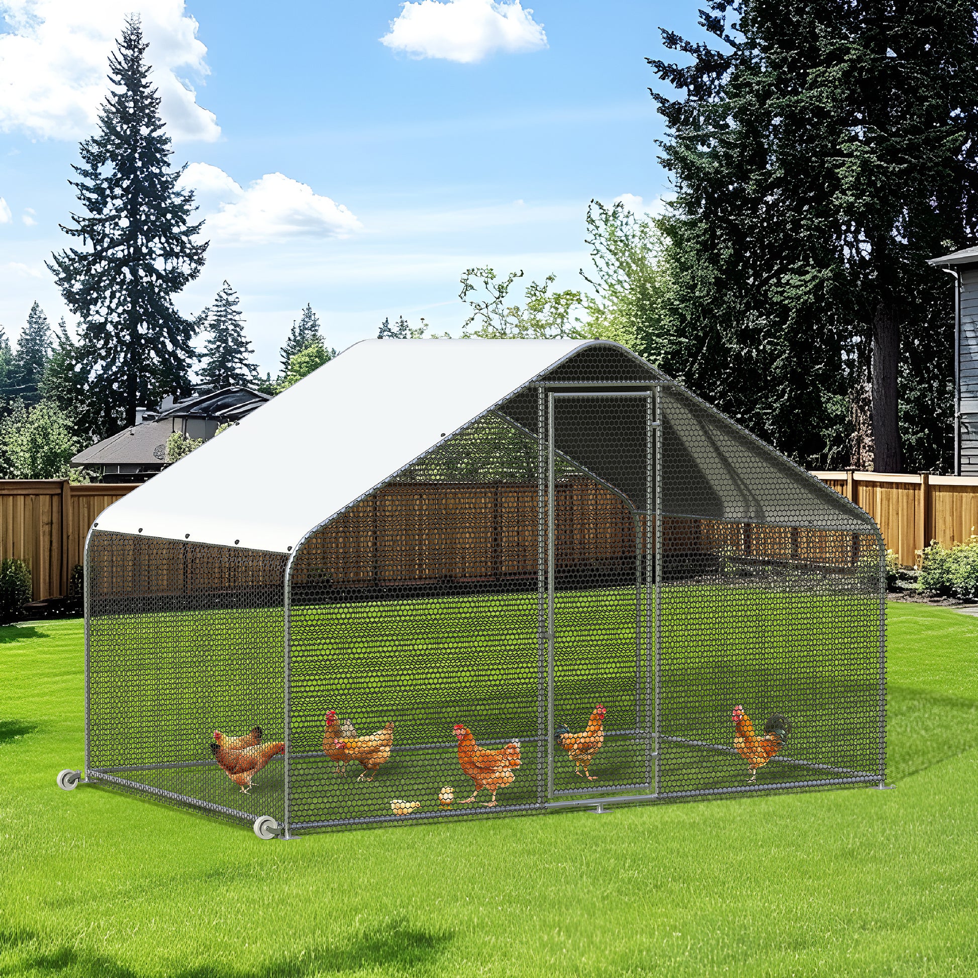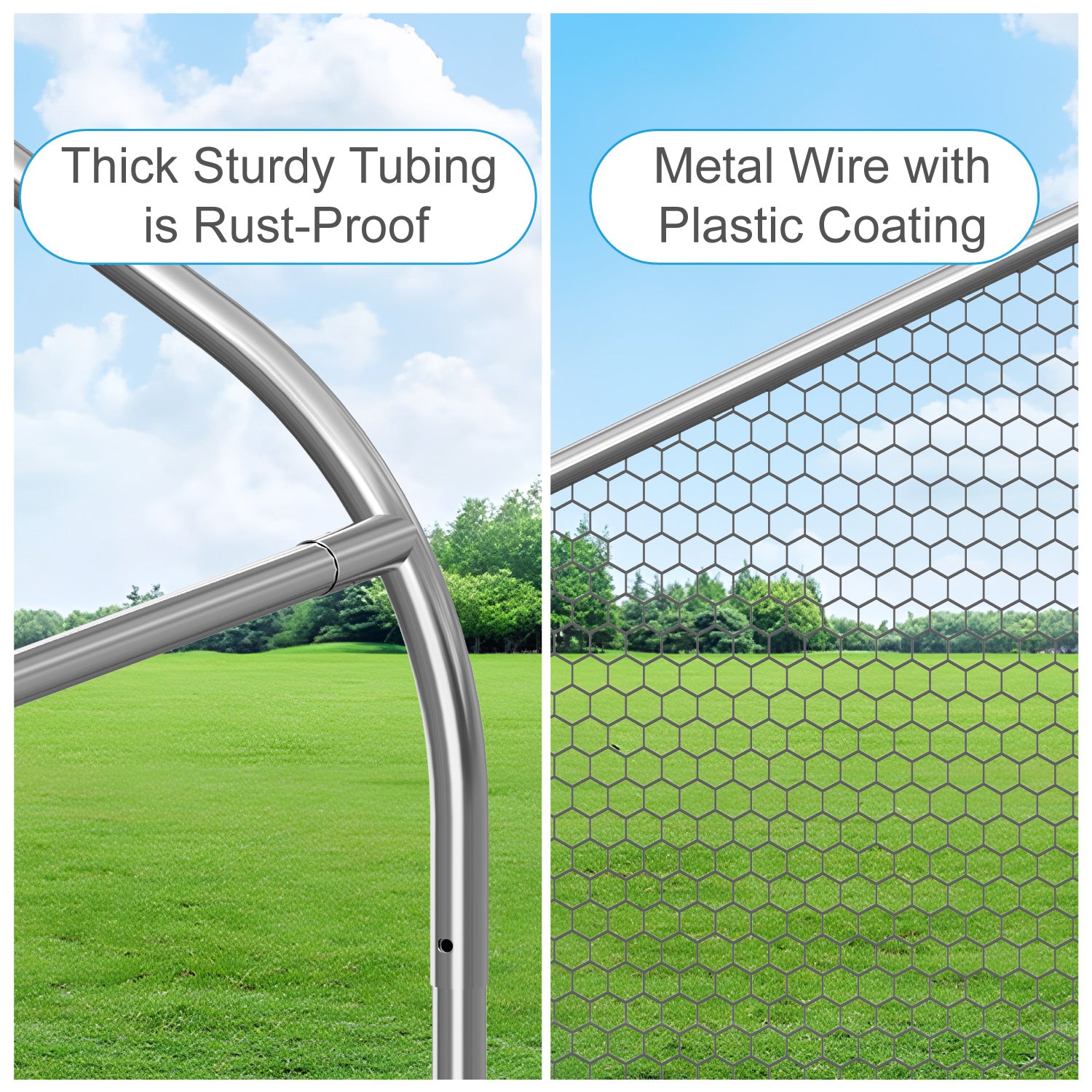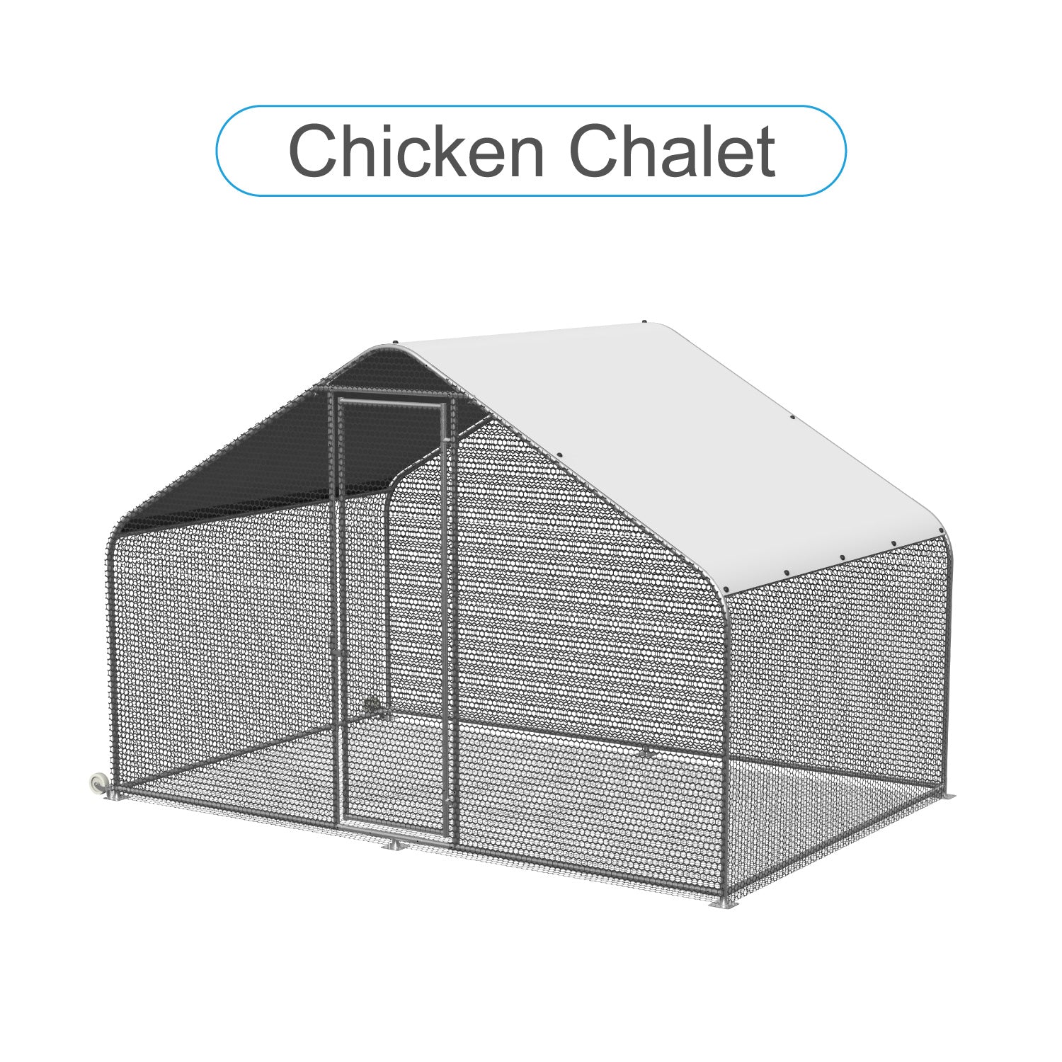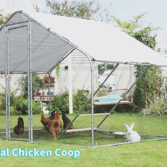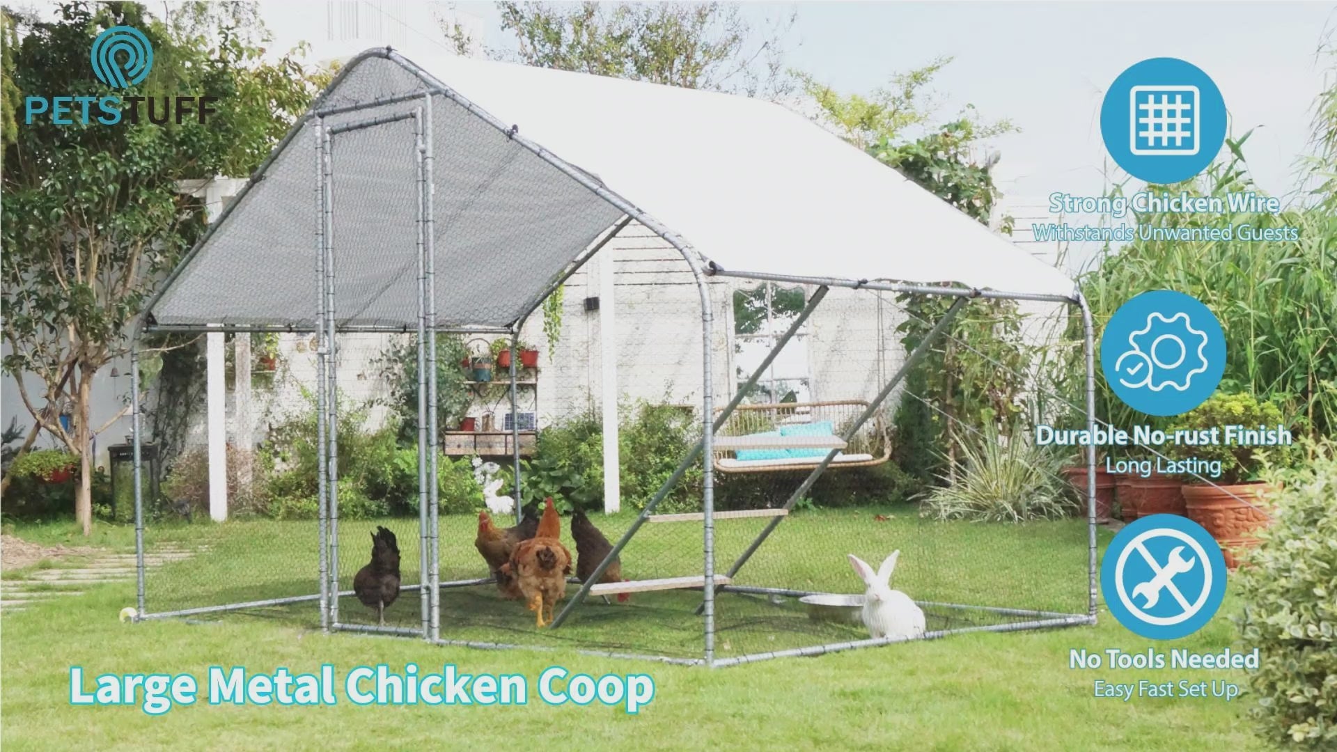 PETS TUFF Metal Chicken Coop offers a secure and safe environment for your chickens, ducks, rabbits, cats, dogs and other small animals. The chicken run is equipped with durable, PVC coated hexagonal wire mesh that is weather-resistant. The strong material boasts tightly spaced gaps to safeguard your chickens from potential predators, ensuring security in the coop. Built to withstand nature, the durable anti-rust frame and thick, rust-proof tubing provide long-lasting dependability. Our coop is equipped with wheels for easy repositioning in your yard. The high peak house-design allows for easy walk-in access, providing a comfortable and secure space where your small animals can roam freely. The UV 50 SPF roof offers sunproof, waterproof, and snowproof protection, keeping your pets safe from harsh weather conditions. An openable window ensures proper air circulation, allowing your animals to stay cool and comfortable no matter the weather.